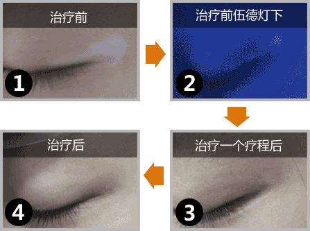 诊断:体内微量元素铜离子含量偏低,免疫力低下,诱发体内黑色素重度脱失。因为眼角部位特殊,特用308进行治疗。