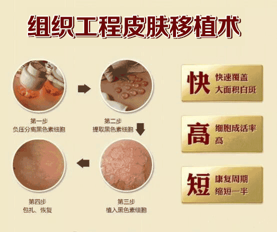 技术原理:通过正常皮肤处自体黑素细胞培养后移植到白斑处,达到治愈目的。