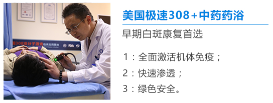 华山专家多年临床经验发现,中医+极速308治疗治疗白癜风效果更好。先采用华山特制中药对患者进行中药雾化/药浴/其他中医治疗,打开闭塞毛孔,逐渐改善微循环;再使用美国极速308激光,将308nm高含量的激光光束集中的照射在患者的白斑部位,祛白更彻底更有效。